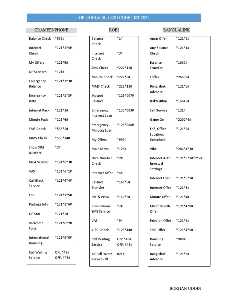 | Banglalink | USSD কোড | প্রযোজ্য নয় | *16001# |